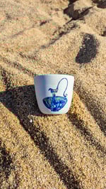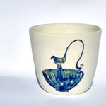 This handcrafted white porcelain cup features a beautifully blue jug carving, symbolizing prosperity.