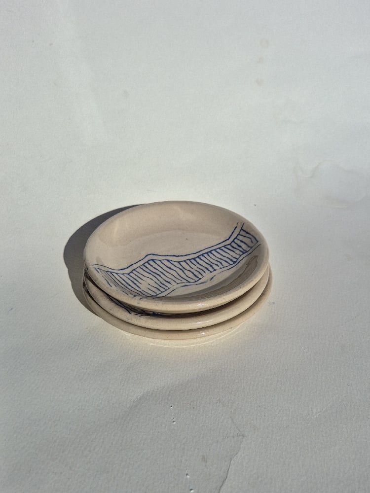 Wheel thrown écru stoneware jewellery dish with inlaid blue design.