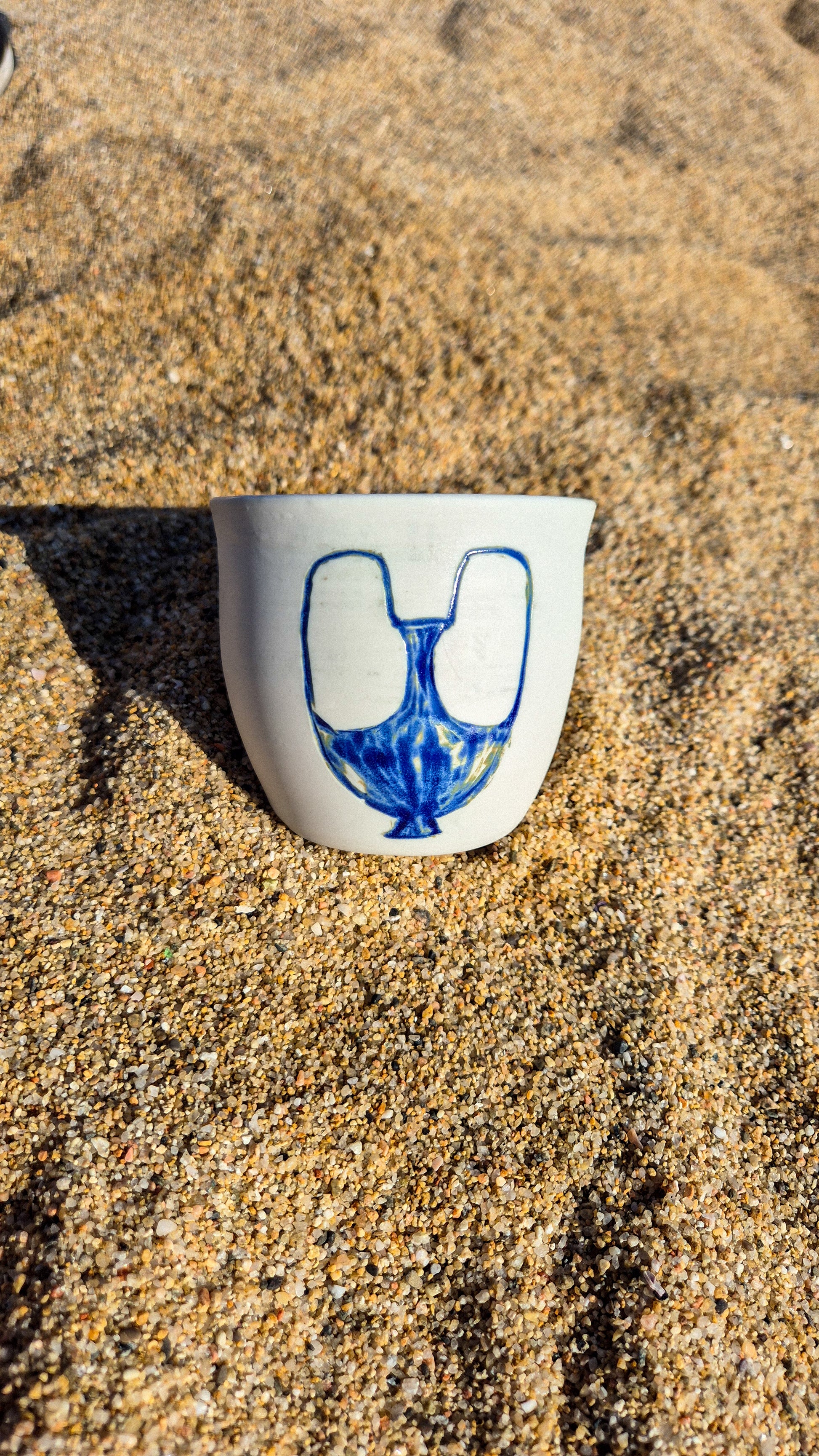 Handmade and uniquely crafted, this VASE CUP is made of white porcelain with a beautiful carved blue vase, displaying strong and big handles.